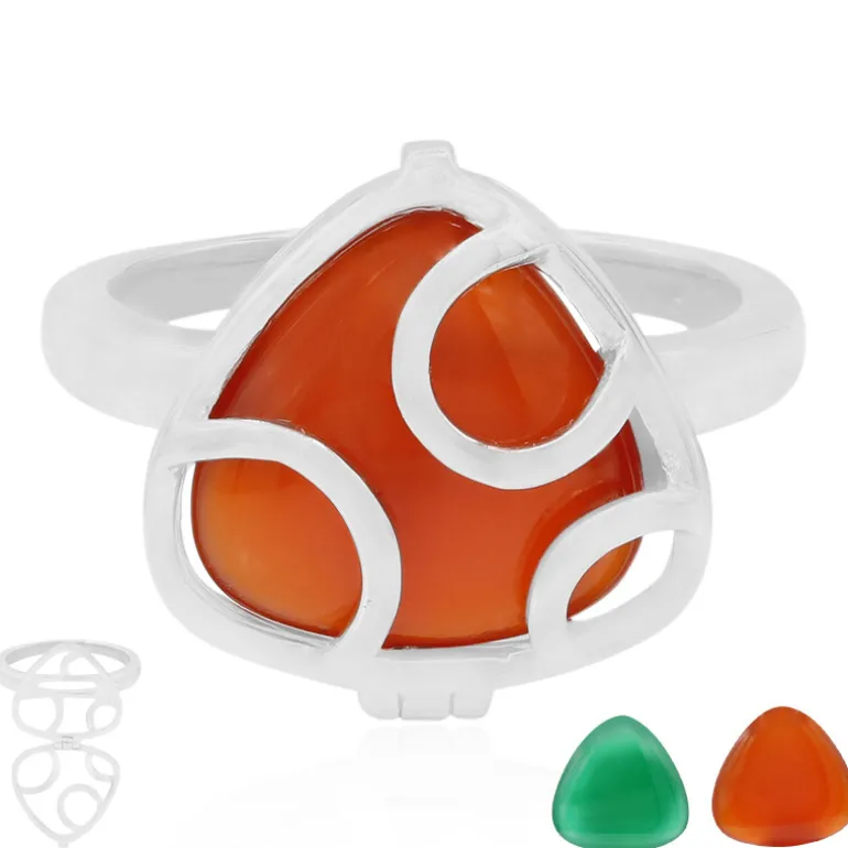 Entdecken Sie eine harmonische Mischung aus leuchtenden Farben und modernem Design in diesem Ring aus Sterlingsilber mit Edelsteinen, die aus den üppigen Landschaften Brasiliens stammen. Zwei Edelsteine im Cabochon-Schliff, grüner Chalzedon und Karneol, vereinen sich in einem einzigen, kühnen Accessoire mit einem Gesamtkaratgewicht von 4,86ct. Der mit viel Liebe zum Detail gefertigte Ring wiegt ca. 2,68 g und eignet sich perfekt, um jedem Outfit einen Farbakzent zu verleihen. Er eignet sich sowohl für legere als auch für gehobene Anlässe und glänzt mit seiner einzigartigen Form und seinem auffälligen Farbton als Statement-Stück.