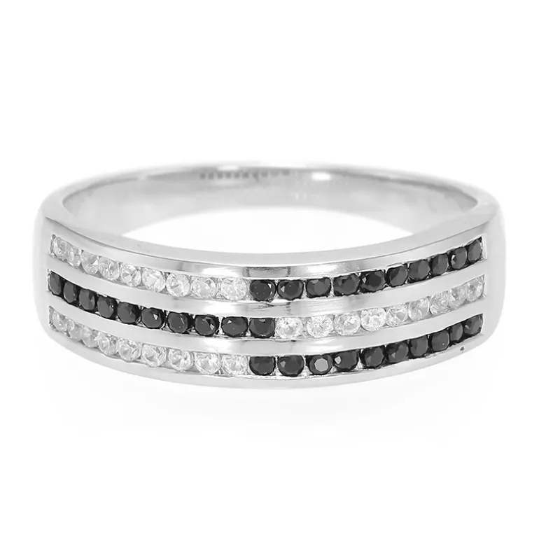 Entdecken Sie die Faszination des Kontrasts mit diesem atemberaubenden Ring aus Sterlingsilber, der ein elegantes Design mit 30 glänzenden schwarzen thailändischen Spinellen und 27 kambodschanischen Zirkonsteinen zeigt. Mit einem Gesamtgewicht von 0,624 Karat, gefasst in poliertem 925er Sterlingsilber, strahlt dieses Schmuckstück Raffinesse aus. Dieser Ring eignet sich perfekt für den Übergang vom Tag zum Abend und verleiht jedem Ensemble einen Hauch von Eleganz. Er verspricht eine vielseitige Ergänzung Ihrer Schmucksammlung zu werden.