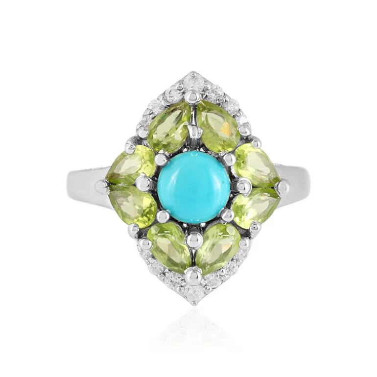 Tauchen Sie ein in die vibrierende Anziehungskraft dieses Rings aus Sterlingsilber, gekrönt von einem runden mexikanischen Campitos-Türkis im Cabochon-Schliff von 0,62 Karat. Umgeben von einem exquisiten Halo aus chinesischem Peridot mit einem Gesamtgewicht von 1,525 ct, funkeln seine Tropfenschliffe in sattem Grün. Ein runder Zirkon aus Tansania verleiht dem Design einen Hauch von Schimmer. Mit seiner eleganten Platinbeschichtung fängt dieser Ring die Essenz des Sommers ein. Er ist ein auffälliges Schmuckstück, das sich perfekt für gesellschaftliche Anlässe eignet oder einen Farbtupfer in Ihre Alltagsgarderobe bringt.