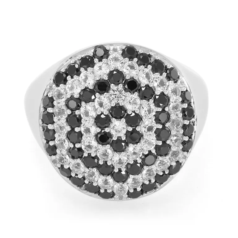 Dieses auffällige Schmuckstück vereint die Kühnheit von 48 schwarzen Spinellen im Brillantschliff mit dem Funkeln von 37 weißen Topasen in einem harmonischen Design. Die aus Thailand und Brasilien stammenden Edelsteine haben ein Gesamtkaratgewicht von 2,628 ct und sind sorgfältig in 925er Sterlingsilber gefasst. Mit einer Größe von 28×24,5 mm ist er ein beeindruckender Blickfang. Das moderne Muster vermittelt einen Hauch von Raffinesse und ist ideal für Abendveranstaltungen oder als auffälliges Accessoire für Geschäftskleidung.