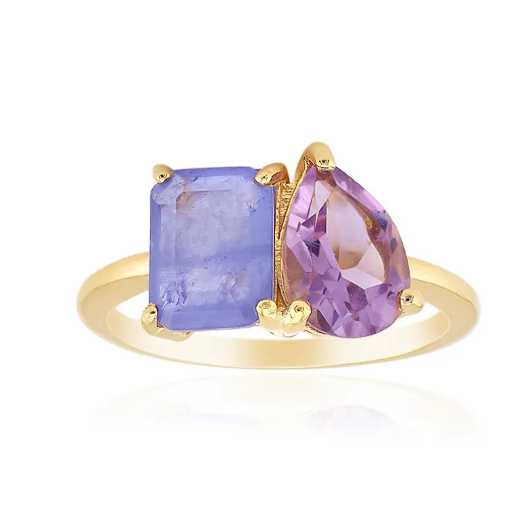 Entdecken Sie die Eleganz dieses Rings aus Sterlingsilber mit zwei Edelsteinen, die fachmännisch vergoldet wurden. Mit einem brasilianischen Amethysten von 1,09 Karat im Tropfenschliff und einem Fliederquarz von 1,06 Karat im Achteck-Stufenschliff. Die leuchtenden Farbtöne machen dieses Schmuckstück zu einem perfekten Begleiter für legere und formelle Anlässe. Kombinieren Sie es mit einem einfachen schwarzen Kleid oder einer eleganten Abendgarderobe, um seinen einzigartigen Charme und seine Raffinesse zu unterstreichen.