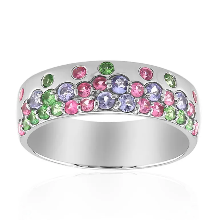 Dieser leuchtende Ring aus 925er Sterlingsilber, der für zusätzliche Brillanz plattiert wurde, bringt ein ganzes Spektrum an Farben zum Leuchten. Der Ring zeigt ein verspieltes Arrangement aus tansanischen Tansaniten und rosa Spinellen mit kenianischen Tsavoriten und hat ein Gesamtgewicht von 0,619 Karat. Die Edelsteine, die in ein poliertes Band gefasst sind, fangen das Licht wunderschön ein. Dieser Ring ist ideal, um einem legeren Outfit einen farbigen Akzent zu verleihen oder einen schicken Abendlook zu ergänzen und wird bei jeder Gelegenheit für Gesprächsstoff sorgen.