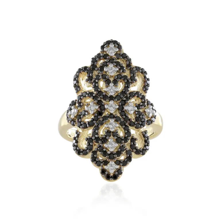 Schmücken Sie Ihre Hand mit diesem exquisiten Ring mit 11 Zirkonen aus Kambodscha und 132 schwarzen Spinellen aus Madagaskar. Die runden Steine sind aus vergoldetem 925er Sterlingsilber gefertigt und bilden ein kompliziertes Muster, das Eleganz ausstrahlt. Dieser Ring ist ideal für Abendveranstaltungen oder um Ihrem täglichen Look einen Hauch von Raffinesse zu verleihen. Er ist ein Highlight für jede Schmucksammlung.