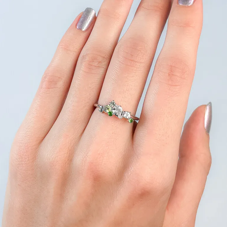 Schmücken Sie Ihre Hand mit einer Symphonie von Farben mit diesem exquisiten Ring aus 925er Sterlingsilber. In der Mitte befindet sich ein weißer Topas aus Nigeria mit einem Gewicht von 0,405 Karat im Tropfenschliff, flankiert von den ruhigen Grüntönen des brasilianischen Amethysts und des lebhaften burmesischen Peridots. Zusätzliches Funkeln kommt von zwei funkelnden Tsavorit-Edelsteinen aus Tansania und burmesischen Peridots. Mit einem Edelsteingewicht von insgesamt 0,74 Karat verbindet dieser 22×20 mm große Ring Eleganz mit einem Hauch von Skurrilität, was ihn zu einer vielseitigen Wahl für legere und formelle Anlässe macht. Kombinieren Sie ihn mit Ihrem Lieblingsoutfit für einen sofortigen Auftrieb.