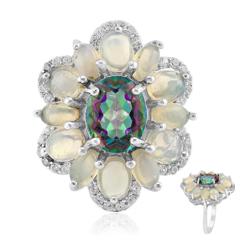 Entdecken Sie diesen auffälligen Ring mit einem atemberaubenden brasilianischen mystischen Quarz in der Mitte, umrahmt von äthiopischen Welo-Opalen und Zirkonen aus Tansania. Dieses aus 925er Sterlingsilber gefertigte Schmuckstück strahlt Eleganz und Raffinesse aus. Es eignet sich perfekt für besondere Anlässe oder als auffälliges Accessoire und lässt sich wunderbar mit Abendkleidern oder einer eleganten Bluse für einen schicken, modernen Look kombinieren.
