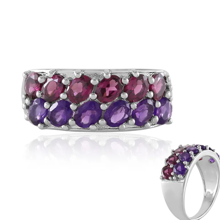 Dieser exquisite Ring präsentiert eine schillernde Reihe von 6 Amethysten aus Sambia und 6 Rhodolithen aus Indien, alle im eleganten Ovalschliff. Er ist aus 925er Sterlingsilber mit einer glänzenden Platinoberfläche gefertigt und hat ein Gesamtkaratgewicht von 2,119 ct. Dieses Schmuckstück ist der perfekte Farbakzent für jedes Outfit und passt sowohl zu Abend- als auch zu Geschäftskleidung, was es zu einer vielseitigen Ergänzung Ihrer Schmucksammlung macht.