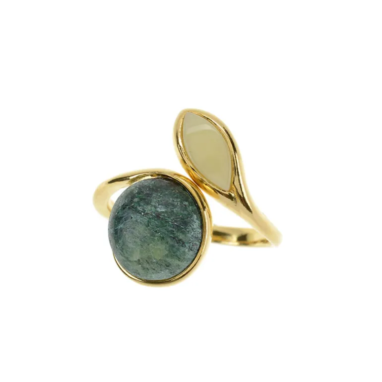 Entdecken Sie die Anziehungskraft kontrastreicher Edelsteine mit diesem eleganten Ring, der einen grünen, runden brasilianischen Fuchsit-Cabochon von 3,16 Karat mit einem eleganten, marquaten baltischen Bernstein-Cabochon von 0,3 Karat kombiniert. Der Ring ist aus vergoldetem 925er Sterlingsilber gefertigt und wiegt ca. 3,29 g. Dieser Ring ist ideal, um Ihrem Ensemble einen Hauch von raffinierten Erdtönen zu verleihen, und verspricht, eine bezaubernde Ergänzung zu Tages- und Abendgarderobe zu sein.