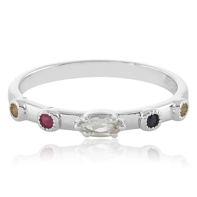 Dieser bezaubernde Ring kombiniert kunstvoll die kühlen Töne des 925er Sterlingsilbers mit einem vielfarbigen Ensemble kostbarer Edelsteine und bringt alltägliche Eleganz an Ihren Finger. Das Herzstück ist ein weißer Topas im Marquiseschliff aus Indien, der von Rubinen im Rundschliff aus Thailand, Zitrinen aus Brasilien und einem blauen Saphir aus Madagaskar flankiert wird. Mit einem Gesamtgewicht von 0,279 ct präsentiert dieser Ring eine harmonische Mischung globaler Schätze in einem subtilen und doch auffälligen Design, das sich sowohl für zwanglose Ausflüge als auch für formellere Anlässe eignet. Seine Vielseitigkeit macht ihn zu einer exquisiten Ergänzung für jede Schmucksammlung.