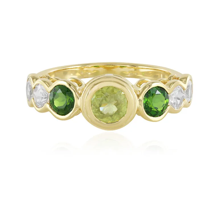 Dieser strahlende Ring ist ein wahrer Schatz an natürlicher Schönheit. In der Mitte befindet sich ein Sphene aus Madagaskar, flankiert von zwei üppigen Diopsid-Edelsteinen aus Russland und ergänzt durch funkelnde weiße Saphire. Jeder Stein ist sorgfältig in runder Brillantform geschliffen, wodurch seine individuellen Farben und sein Glanz noch besser zur Geltung kommen. Gegossen in 925er Sterlingsilber mit einer luxuriösen Vergoldung, setzt dieser Ring ein opulentes Zeichen. Perfekt für besondere Anlässe oder als hervorstechendes Accessoire für den Alltag, seine Vielseitigkeit wird jeden Schmuckliebhaber begeistern.