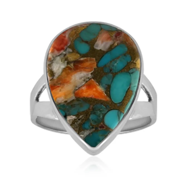 Tauchen Sie ein in eine Welt voller Farben mit diesem atemberaubenden Silberring mit einem Mosaik aus leuchtend blauem Kingman-Mohave-Türkis und feurig orangefarbener Dornauster. Die kühne Mischung der Farbtöne macht ihn zu einem auffälligen Accessoire, das jedem Outfit einen Hauch von Farbe verleiht. Dieser Ring eignet sich sowohl für legere Tage als auch für besondere Anlässe und lässt sich wunderbar mit Bohème-Styles und Erdtönen kombinieren, die ein einzigartiges, künstlerisches Flair widerspiegeln.