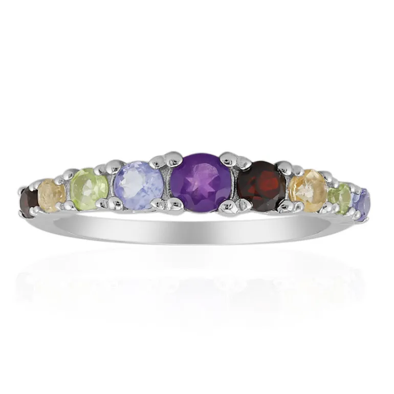Entdecken Sie die lebendige Anziehungskraft dieses Rings aus Sterlingsilber, der mit einer Symphonie kostbarer Edelsteine geschmückt ist. Das Herzstück ist ein bezaubernder Amethyst aus Sambia, flankiert von glänzenden Granaten, Tansaniten, burmesischen Peridots und brasilianischen Zitrinen, die alle sorgfältig rund geschliffen wurden, um ihre Farbe und ihr Funkeln zu betonen. Mit einem Gesamtkaratgewicht von 0,655 ct hat dieser Ring eine Größe von 20×20 mm, was ihn zu einem perfekten Statement macht. Das Band aus 925er Sterlingsilber bietet eine elegante Grundlage für die regenbogenfarbenen Edelsteine und passt sowohl zu legeren als auch zu formellen Anlässen. Dieser Ring ist ein wahrer Schatz für Edelsteinliebhaber und verspricht, eine wertvolle Ergänzung für jede Sammlung zu werden.