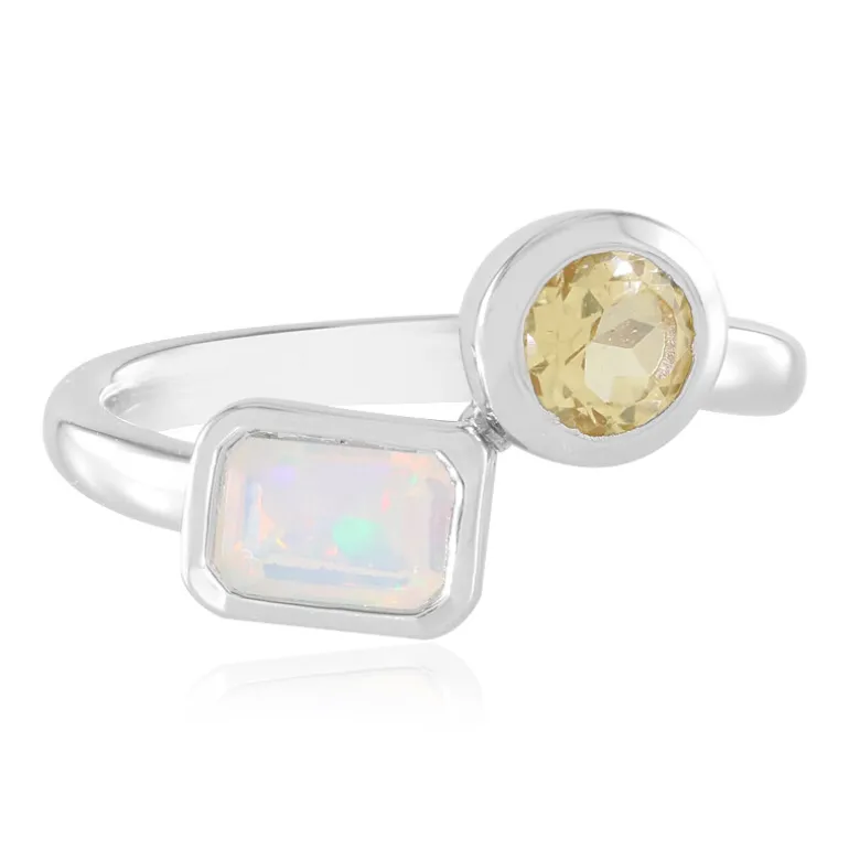Entdecken Sie die lebendige Anziehungskraft dieses exquisiten Rings mit einem 0,298-karätigen Welo-Opal aus Äthiopien und einem 0,406-karätigen gelben Beryll aus Brasilien. Der Ring ist aus platiniertem 925er Sterlingsilber gefertigt und verbindet Eleganz mit einem modernen Touch. Es passt sowohl zu legeren als auch zu formellen Anlässen und ergänzt elegante Abendkleider oder schicke Tagesoutfits. Eine zeitlose Ergänzung für jede Schmucksammlung.