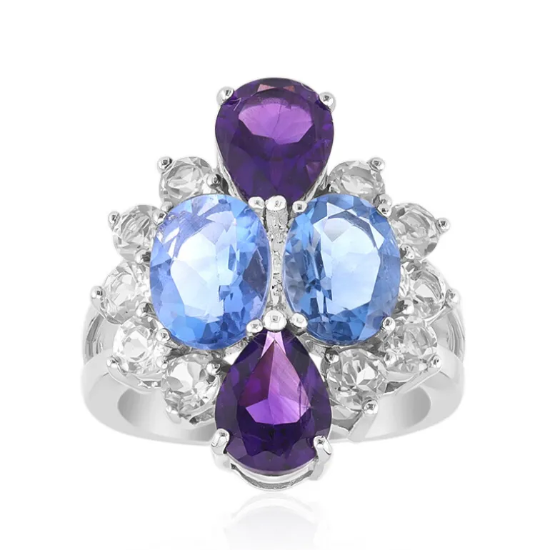 Entdecken Sie den Reiz der Farbverwandlung mit unserem exquisiten Ring aus Fluorit und Amethyst im Farbwechsel. Dieses 5,675-karätige Schmuckstück aus platiniertem 925er Sterling Silber zeigt den faszinierenden Tanz der Farben in den oval geschliffenen Fluoriten, die von birnenförmigen sambischen Amethysten und funkelnden brasilianischen weißen Topasen flankiert werden. Dieser 23×20 mm große Ring sorgt für Gesprächsstoff und ist ideal für Abendveranstaltungen oder um Ihrem Alltagsstil einen Hauch von Magie zu verleihen.
