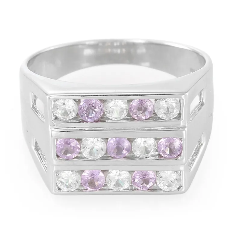 Gönnen Sie sich den Luxus von Edelsteinen aus Sri Lanka mit diesem atemberaubenden Ring. Gefertigt aus 925er Sterlingsilber, besticht das elegante Design durch eine Reihe von nicht erhitzten violetten Ceylon-Saphiren und brillanten kambodschanischen Zirkonen mit einem Gesamtkaratgewicht von 1,462. Dieser Ring eignet sich perfekt, um jedem Outfit einen Farbtupfer zu verleihen, und ist eine elegante Wahl für besondere Anlässe oder als auffällige Ergänzung zu Ihrem Alltagsoutfit.