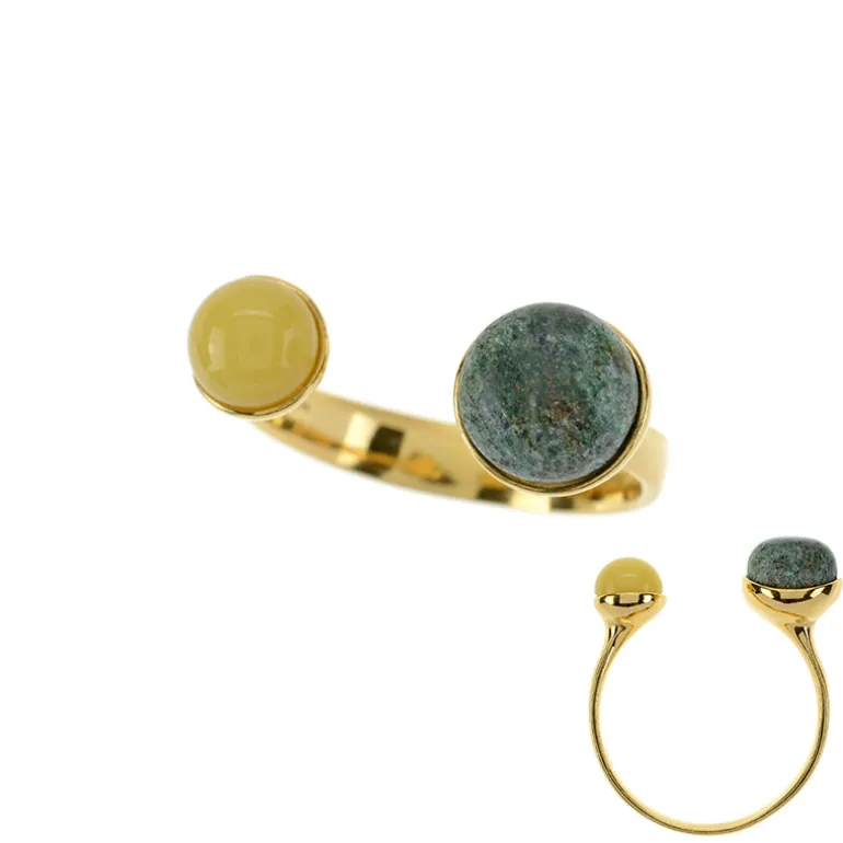 Entdecken Sie die lebendige Mischung aus brasilianischem Fuchsit und baltischem Bernstein in diesem exquisiten Ring aus vergoldetem Sterlingsilber. Das offene Design zeigt einen 2,42 Karat großen runden Cabochon aus tiefgrünem Fuchsit, gepaart mit einem 0,36 Karat großen goldenen Cabochon aus baltischem Bernstein, der einen einzigartigen Kontrast schafft, der perfekt für jede Gelegenheit ist. Er ist ideal, um Ihrem Ensemble einen Hauch von Raffinesse zu verleihen, und wird zu einem festen Bestandteil Ihrer Schmucksammlung. Egal, ob Sie sich für eine Abendveranstaltung herausputzen oder Ihren Tageslook akzentuieren möchten, das Gesamtgewicht von 2,78 Karat und die zeitlose Eleganz machen diesen Ring zu einer außergewöhnlichen Wahl.