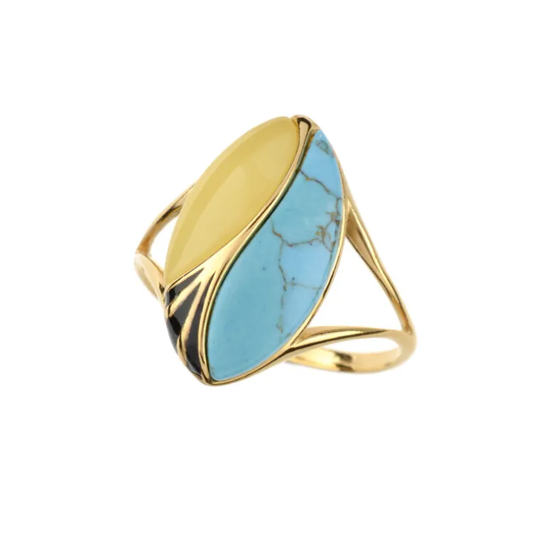 Entdecken Sie die exquisite Mischung aus US-amerikanischem Türkis und polnischem milchigem Bernstein in diesem eleganten Ring. Gefertigt aus 925er Sterlingsilber, vergoldet für ein luxuriöses Finish, bietet dieses Stück ein einzigartiges Fancy-Cabochon und Marquise-Cabochon Design. Perfekt, um Ihrer Abendgarderobe einen farbigen Akzent zu verleihen oder Ihren Alltagsstil mit einem Hauch von Raffinesse aufzuwerten. Ideal für besondere Anlässe oder zum Verschenken.