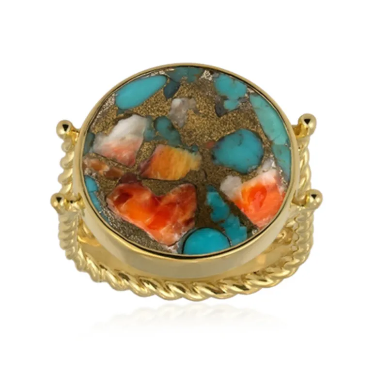 Entdecken Sie die Faszination des Kingman-Mohave-Türkis-Silberrings, der ein lebhaftes Mosaik aus blauem Kingman-Mohave-Türkis und orangefarbener Stachelauster zeigt. Dieses einzigartige Stück mit den Maßen 23×22 mm fängt die Essenz der böhmischen Eleganz ein und macht ihn zu einem herausragenden Accessoire für jedes Ensemble. Dieser Ring eignet sich perfekt für zwanglose Ausflüge oder als Farbtupfer für formelle Anlässe und ist eine vielseitige Ergänzung für jede Schmucksammlung.