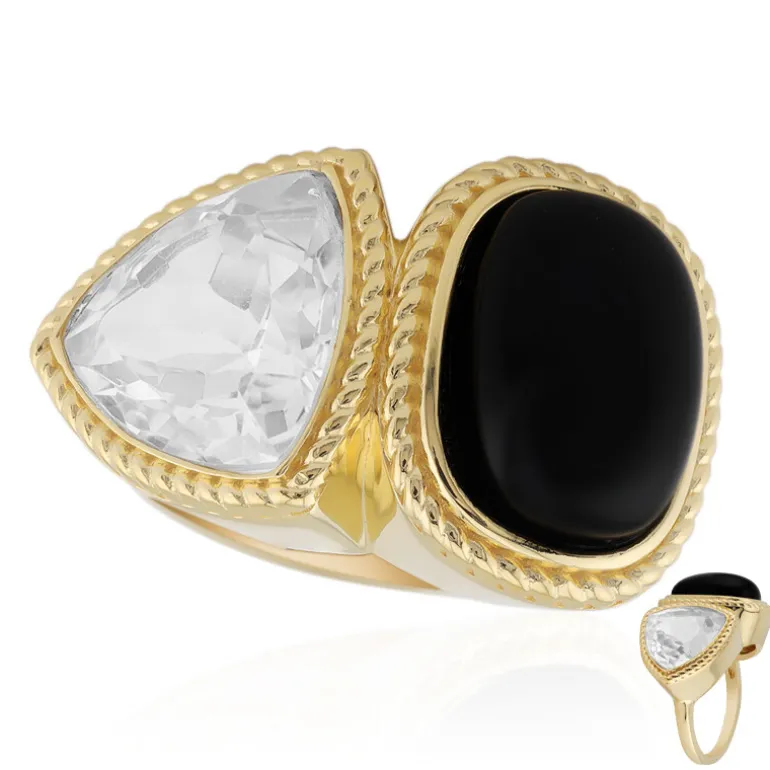 Entdecken Sie die fesselnde Anziehungskraft dieses markanten Rings aus der Monosono-Kollektion. Dieses Schmuckstück aus vergoldetem 925er Sterlingsilber besteht aus einem schwarzen Onyx mit 5,738 Karat aus Indien und einem weißen Topas mit 6,615 Karat Brillant aus Nigeria. Dieser Ring eignet sich perfekt für besondere Anlässe oder als eleganter Begleiter für den Alltag und passt sowohl zu formellen als auch zu legeren Outfits.