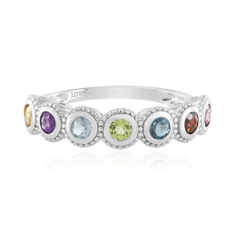 Entdecken Sie die Farben der Welt mit diesem wunderschön gearbeiteten Ring, der einen Teppich aus Edelsteinen wie Amethyst, Rhodolith, Peridot, Citrin und himmelblauem Topas enthält, die alle von exotischen Orten rund um den Globus stammen. Die rund geschliffenen Edelsteine haben ein Gesamtgewicht von 0,832 Karat und sind in ein elegantes Band aus platiniertem 925er Sterlingsilber eingebettet. Dieser Ring ist perfekt, um jedem Outfit einen Farbtupfer zu verleihen. Er eignet sich sowohl für zwanglose Ausflüge als auch für besondere Anlässe und ist somit eine vielseitige Ergänzung für jede Schmucksammlung.
