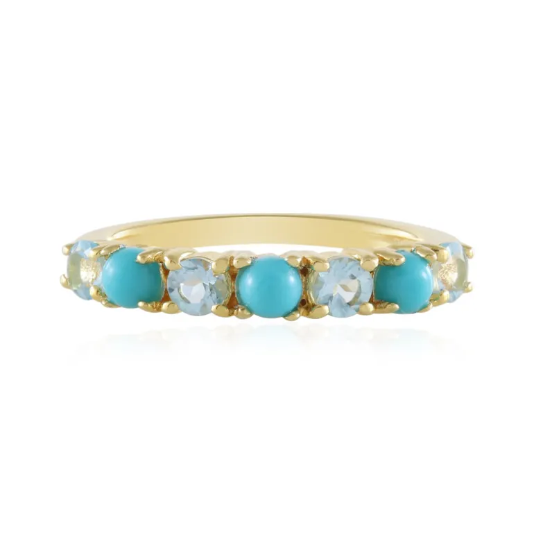 Dieser exquisite Ring zeigt leuchtende Dornröschen-Türkiscabochons aus den USA gepaart mit funkelndem Schweizer Blautopas aus Brasilien. Das 1,6 g leichte Schmuckstück ist aus vergoldetem 925er Sterlingsilber gefertigt und strahlt Eleganz aus. Perfekt, um Ihrem Alltagsoutfit einen Farbakzent zu verleihen oder Ihre Abendgarderobe zu ergänzen. Eine raffinierte Wahl sowohl für legere als auch für formelle Anlässe.