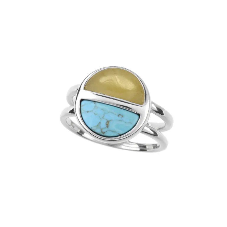 Dieser bezaubernde Ring kombiniert das ruhige Blau des US-Türkises mit dem warmen Schimmer des polnischen baltischen Bernsteins, beide gefasst in einem eleganten 925er Sterlingsilberband. Die ausgefallenen Cabochon-Steine bilden einen einzigartigen Kontrast, der jedem Outfit einen Hauch von Eleganz verleiht. Dieses Schmuckstück ist ideal für zwanglose Ausflüge oder besondere Anlässe und stellt eine vielseitige Ergänzung für jede Schmucksammlung dar.