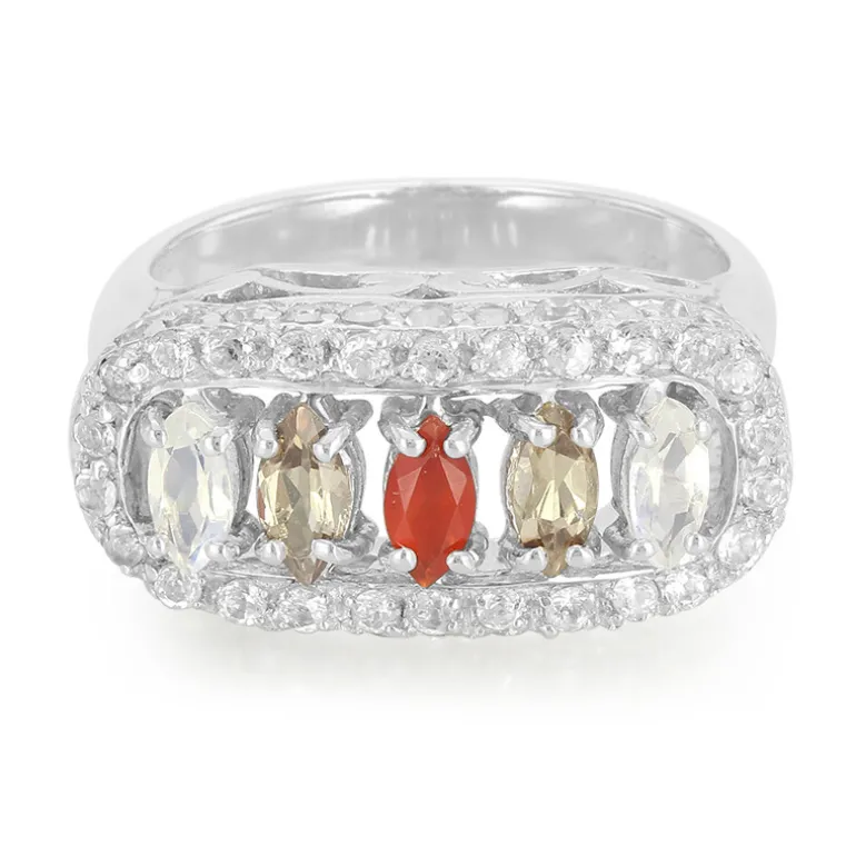 Entdecken Sie die Faszination des Marquise Multi-Gem Sterling Silberrings, der mit exquisiten Details gefertigt wurde. Fünf lebhafte Edelsteine im Marquise-Schliff aus aller Welt werden von 56 funkelnden brasilianischen weißen Topasen wunderbar ergänzt. Mit einem Gewicht von 4,57 g ist dieses Meisterwerk aus 925er Sterlingsilber perfekt geeignet, um der Abendgarderobe Eleganz zu verleihen oder Alltagsoutfits eine schicke Note zu verleihen. Ein Muss für jede Schmuckliebhaberin.