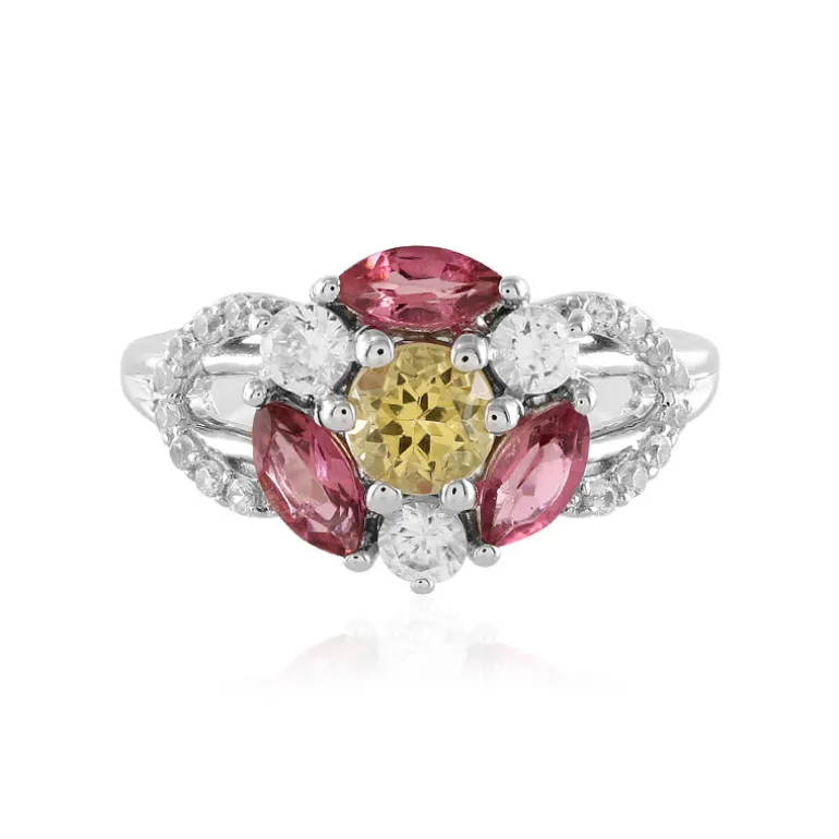 Begeben Sie sich auf eine stilvolle Reise mit diesem bezaubernden Silberring, der ein Trio rosa Turmaline im Marquiseschliff aus Nigeria mit einem Gesamtgewicht von 0,647 ct enthält, die elegant einen gelben Beryll mit rundem Brillantschliff aus Brasilien mit 0,433 ct flankieren. Das platinierte Stück aus 925er Sterlingsilber wiegt etwa 2,25 g und wird von einer Reihe funkelnder Zirkone aus Kambodscha mit weiteren 0,629 ct ergänzt. Mit einem Gesamtkaratgewicht von 1,709 ct. ist der Ring mit seinen Abmessungen von 22 x 20 mm ein echter Blickfang. Er eignet sich ideal für besondere Anlässe oder als luxuriöses Accessoire für den Alltag und sorgt für Gesprächsstoff.