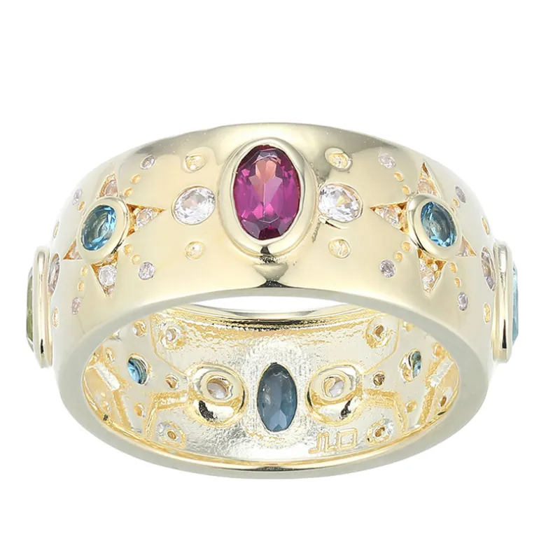 Entdecken Sie die lebhafte Eleganz dieses mehrreihigen vergoldeten Rings aus Sterlingsilber. Mit einer atemberaubenden Konstellation von Edelsteinen, darunter Londoner Blautopas, Peridot, Rhodolith und Zirkon, bietet dieses Schmuckstück ein Kaleidoskop aus Farbe und Brillanz. Er eignet sich sowohl für legere als auch formelle Outfits und ist eine exquisite Wahl für alle, die ein einzigartiges Accessoire suchen.