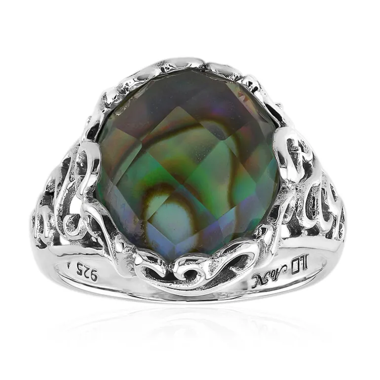 Entdecken Sie die bezaubernde Verschmelzung von weißem Quarz aus Madagaskar und chinesischer Abalone, die in diesem Ring aus 925er Sterlingsilber exquisit präsentiert wird. In der Mitte befindet sich ein ovaler weißer Quarz im Schachbrettschliff von 3,315 Karat, der von einer schillernden Abalone-Schale flankiert wird, die ein bezauberndes Lichtspiel erzeugt. Dieser Ring ist ideal, um jedem Outfit einen Hauch von natürlicher Eleganz zu verleihen. Er besticht bei geselligen Zusammenkünften oder intimen Anlässen und verkörpert die Schönheit der Kunstfertigkeit der Natur.