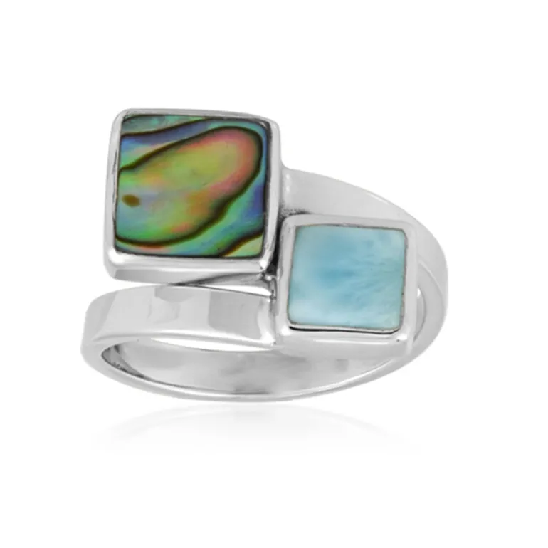 Tauchen Sie ein in die Eleganz mit diesem atemberaubenden Ring aus Sterlingsilber mit einer Abalone-Muschel aus Neuseeland und einem 1-karätigen Larimar aus der Dominikanischen Republik. Die im Carré-Schliff gefassten Edelsteine sind ein echter Blickfang und verleihen jedem Outfit einen modernen Touch. Dieser Ring eignet sich perfekt für zwanglose Ausflüge oder Abende. Er verkörpert leuchtende Farben und einen einzigartigen Stil und bereichert Ihre Schmucksammlung mit seinem exquisiten Charme.