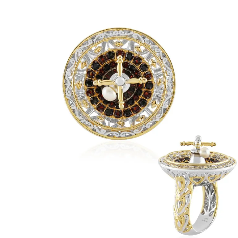 Tauchen Sie ein in die Welt der zeitlosen Eleganz mit diesem Ring im Vintage-Stil, einer perfekten Mischung aus klassischem Charme und moderner Handwerkskunst. Der aus 925er Sterlingsilber gefertigte Ring besticht durch eine faszinierende Anordnung reicher Granate, die in ein einzigartiges Zifferblattdesign gefasst sind, das an eine vergangene Ära erinnert. Die kontrastierende Goldplattierung verleiht ihm einen Hauch von Luxus und macht ihn zu einem idealen Statement-Stück für Cocktail-Events oder einen raffinierten Ausgehabend. Kombinieren Sie diesen exquisiten Ring mit Ihrem Lieblingsabendkleid, um Ihr Ensemble mit einem Hauch von altem Glamour zu vervollständigen.