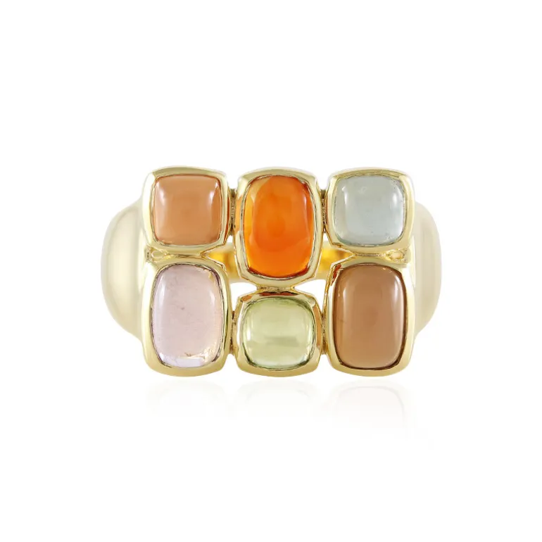 Erleben Sie eine Explosion der Farben mit diesem exquisiten mehrreihigen Ring von KM Juwelo. In hochwertigem vergoldetem 925er Sterlingsilber gefasst, ist jeder Edelstein ein einzigartiger antiker Cabochon, darunter Schokoladenmondstein, lavendelfarbener Amethyst, roter Karneol, Peridot, Pfirsichmondstein und Aquamarin. Dieser Ring ist perfekt geeignet, um sowohl legere als auch formelle Outfits mit Eleganz zu bereichern. Er ist eine aromatische Mischung aus leuchtenden Farbtönen, ideal für jede Gelegenheit.