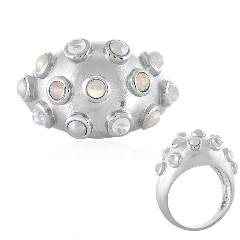 Entdecken Sie eine Symphonie des Glanzes mit diesem Ring aus Sterlingsilber, der eine bezaubernde Reihe von runden Süßwasserperlen aus China, Regenbogen-Mondsteinen aus Indien und Welo-Opalen aus Äthiopien präsentiert. Das Design des Rings ist ein himmlisches Fest mit Mondsteinen von 0,778 Karat und Opalen von 0,207 Karat, die zusammen mit cremefarbenen Perlen auf einem platinierten 925er-Sterlingsilberband gefasst sind und etwa 8 Gramm wiegen. Er eignet sich perfekt, um jedem Outfit einen Hauch von Eleganz zu verleihen, und ist vielseitig genug, um im Alltag oder zu besonderen Anlässen getragen zu werden. Das zauberhafte Farbenspiel macht ihn zu einem idealen Accessoire für alle, die gerne glänzen.