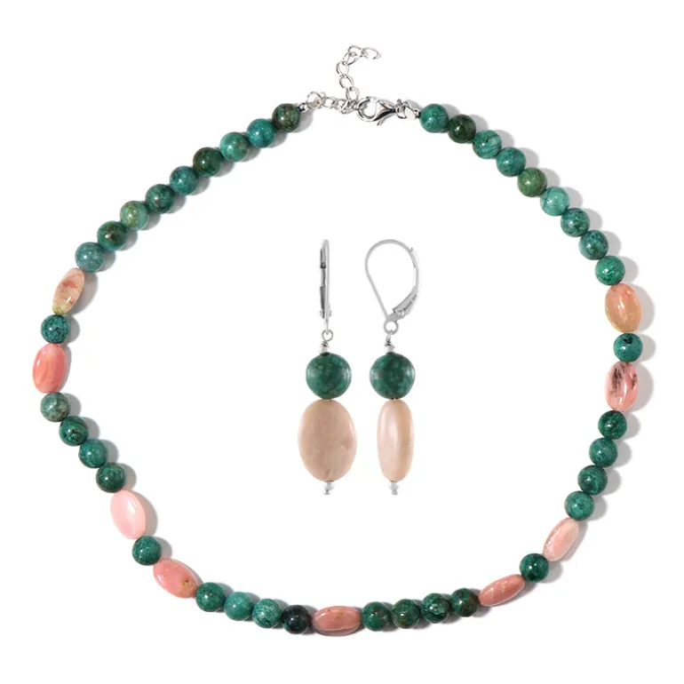 Entdecken Sie ein atemberaubendes Schmuckset mit leuchtenden Edelsteinen in einer Mischung aus Grün- und Rosatönen, gefertigt aus 925er Sterling Silber. Die verstellbare Halskette (45-48,5 cm) lässt sich wunderbar mit den 44-mm-Ohrringen kombinieren und eignet sich sowohl für zwanglose Zusammenkünfte als auch für elegante Abende. Erweitern Sie Ihre Garderobe mit diesem schicken Set, das jedem Outfit einen Hauch von Farbe und Raffinesse verleiht.