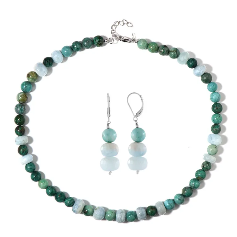 Entdecken Sie die Eleganz dieses Aquamarin-Sterlingsilber-Sets mit einer passenden Halskette und Ohrringen. Die beruhigenden Grüntöne der Aquamarin-Perlen verleihen jedem Ensemble einen natürlichen Charme. Perfekt für legere Ausflüge oder abendliche Anlässe, kombinieren Sie dieses Set mit einer einfachen Bluse oder einem fließenden Kleid, um seine ruhige Schönheit zu unterstreichen. Ein Must-Have für alle, die subtile Raffinesse zu schätzen wissen.