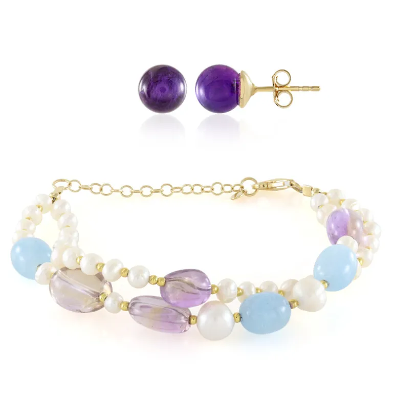 Dieses atemberaubende Schmuckset besteht aus einer harmonischen Mischung aus Amethysten, Aquamarinen, Ametrinen und weißen Süßwasserperlen, die mit goldenen Hämatitperlen akzentuiert sind. Das aus 925er Sterlingsilber gefertigte und mit einer üppigen Goldauflage versehene Armband (17-22 cm) und die Ohrringe verkörpern Vielseitigkeit und Anmut. Die Edelsteine stammen aus Sambia, Brasilien, Bolivien und China und versprühen einen Hauch von globaler Eleganz. Dieses Set ist perfekt für alle, die einen Hauch von Farbe und natürlicher Pracht in ihren Accessoires zu schätzen wissen, und eignet sich sowohl für den Alltag als auch für Abendveranstaltungen.