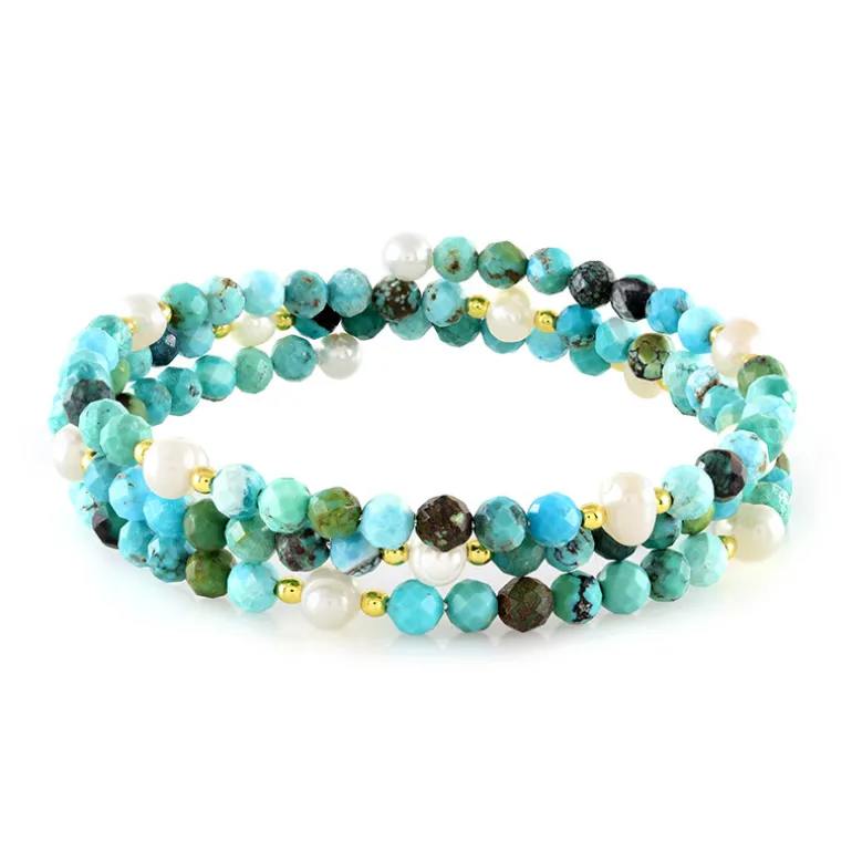 Entdecken Sie die vibrierende Schönheit unseres Armreifs aus Türkis und goldenem Hämatit, ein stilvolles Schmuckstück. Der aus den USA stammende Armreif besticht durch facettierte Türkisperlen von 36,66 Karat in verschiedenen Größen, die durch goldene Hämatitperlen von insgesamt 2,871 Karat ergänzt werden. Neben diesen Edelsteinen glänzen weiße Süßwasserperlen aus China, die mit ihren einzigartigen, runden Formen einen Hauch von Eleganz verleihen. Dieses 60×60 mm große Armband aus robustem Stahl verkörpert sowohl schicke Raffinesse als auch lässigen Charme und ist somit ein ideales Accessoire, um Ihrem Alltagsoutfit einen Hauch von Farbe zu verleihen oder ein Outfit für einen besonderen Anlass aufzuwerten.