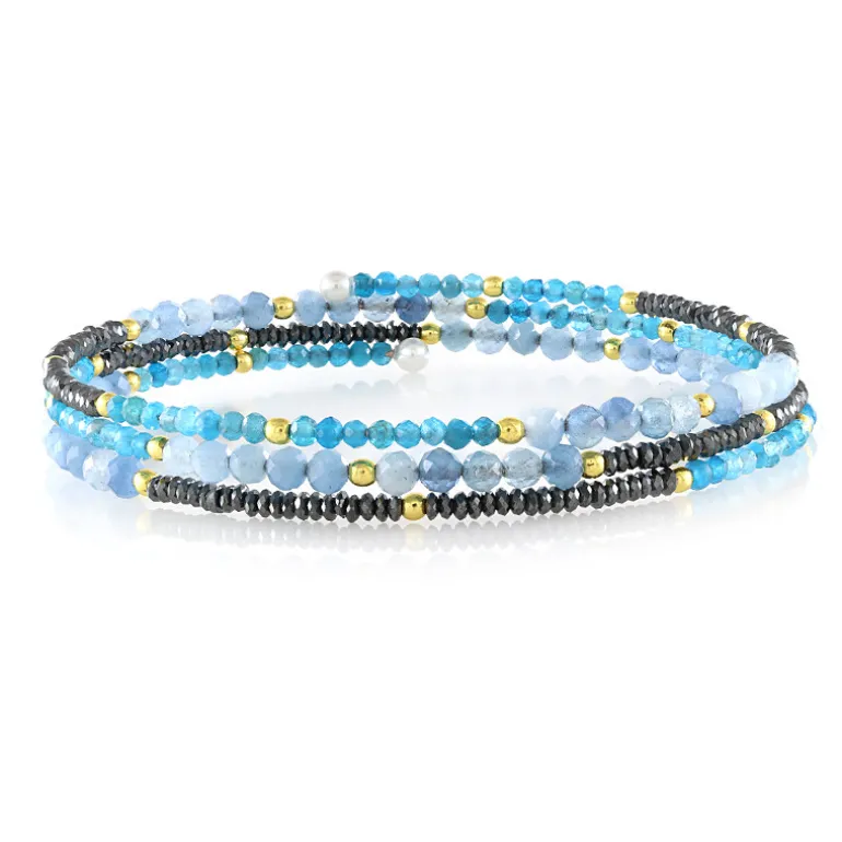 Entdecken Sie die Anziehungskraft dieses exquisiten Armreifs mit einer lebhaften Mischung aus Edelsteinen. Die aquamarinfarbenen und neonblauen Apatit-Perlen aus Brasilien, die von schwarzem und goldenem Hämatit ergänzt werden, lassen dieses Schmuckstück in bezaubernden Farben schimmern. Mit weißen Süßwasserperlen akzentuiert, ist es perfekt, um jedes legere Ensemble aufzuwerten. Ideal für Strandausflüge oder Treffen mit Freunden, verleiht es Ihrem Stil einen Hauch von Eleganz.