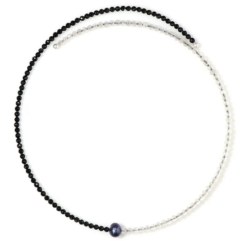 Entdecken Sie die Anziehungskraft dieser schicken Halskette, die schwarzen Spinell und regenbogenfarbene Mondsteine kombiniert. Mit den auffälligen schwarzen Zuchtperlen und den eleganten weißen Süßwasserperlen bietet die Kette einen raffinierten Kontrast. Perfekt für die Abendgarderobe oder als elegante Ergänzung zu Freizeitoutfits. Es ist ein Statement-Stück, das moderne Eleganz und zeitlosen Charme verkörpert.
