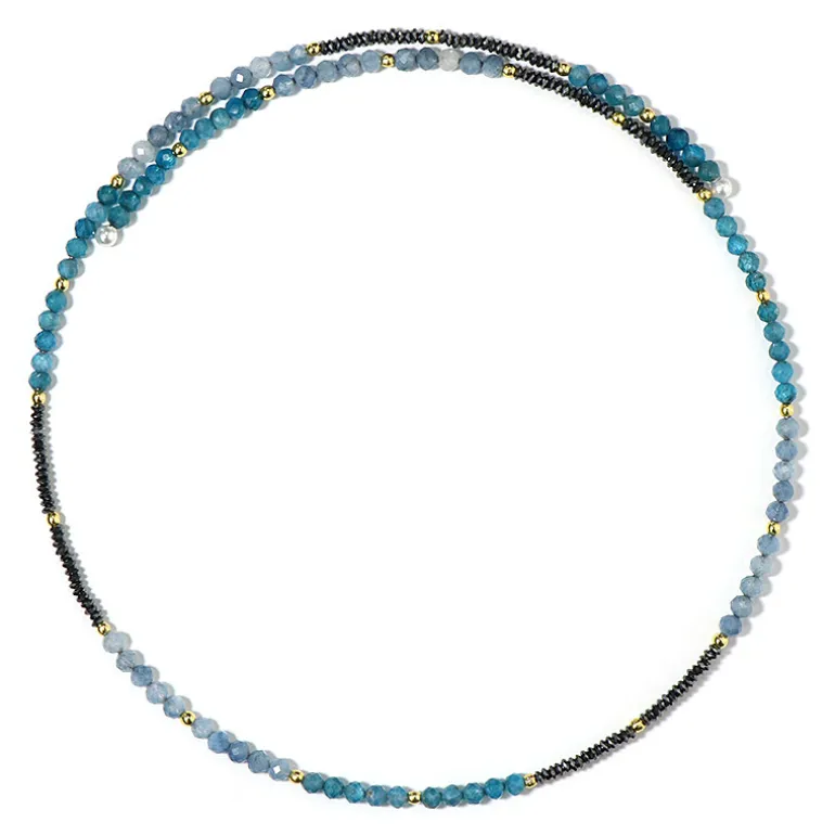 Diese atemberaubende Halskette mit brasilianischem Aquamarin und neonblauen Apatit-Perlen verleiht Ihnen Eleganz. Akzentuiert durch schwarzen und goldenen Hämatit aus den USA und zarte weiße Süßwasserperlen aus China, ist jede facettierte Perle sorgfältig für ein harmonisches Design arrangiert. Perfekt, um jedem Ensemble einen Hauch von Raffinesse zu verleihen, sei es bei einer formellen Veranstaltung oder einer schicken Zusammenkunft.