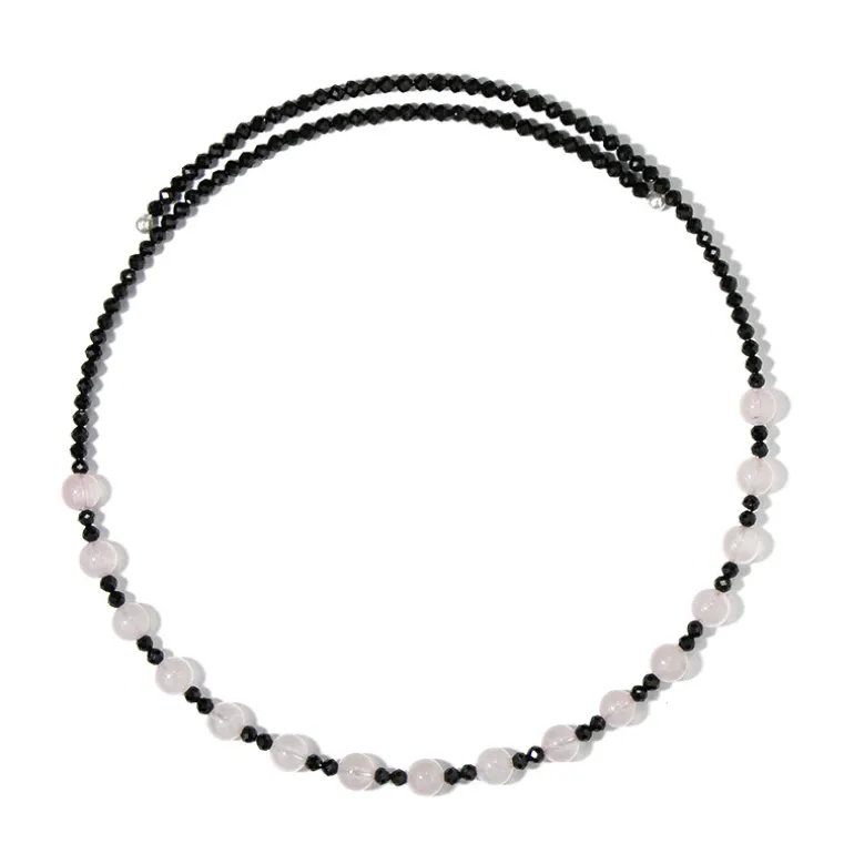 Mit dieser atemberaubenden Halskette mit Rosenquarzperlen aus Brasilien und facettierten schwarzen Spinellen aus Thailand, die durch die Eleganz runder weißer Süßwasserperlen aus China ausgeglichen werden, verleihen Sie Ihrem Stil einen besonderen Touch. Die Halskette ist aus robustem Stahl gefertigt und strahlt Raffinesse aus. Sie eignet sich sowohl für legere als auch für formelle Anlässe und kann mit einem schicken Kleid oder einer frischen Bluse kombiniert werden, um einen zeitlosen Look zu erzielen.
