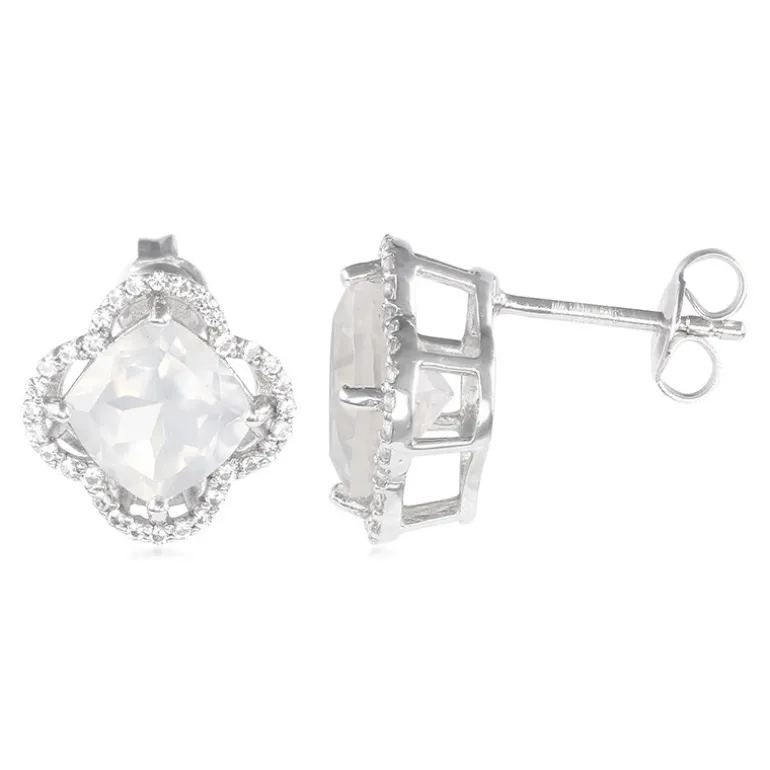 Entdecken Sie die Eleganz dieser Eismond-Quarz-Ohrringe mit zwei brasilianischen mondfarbenen Steinen im antiken Kissenschliff. Akzentuiert durch einen Halo aus weißem Topas im Brillantrundschliff, gefasst in Sterlingsilber, schimmern diese Ohrringe bei jeder Bewegung. Sie eignen sich perfekt für formelle Anlässe oder als elegante Ergänzung zu Alltagskleidung und passen wunderbar zu zarten Pastelltönen oder klassischen schwarzen Kleidern.