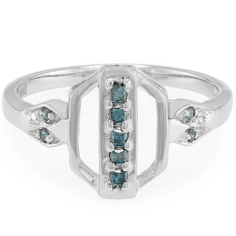Dieser schicke Ring aus platiniertem 925er Sterlingsilber glänzt mit 0,15 Karat ausgefallener Diamanten. Eine einzigartige Reihe von Diamanten im Prinzess-Schliff von insgesamt 0,12 Karat und vier weitere Diamanten im Rundschliff von 0,03 Karat sorgen für einen modernen, geometrischen Look. Jeder Edelstein ist aufwändig gefasst, um sein Funkeln auf dem schlanken Silberband, das etwa 2,5 Gramm wiegt, zur Geltung zu bringen. Dieser Ring eignet sich perfekt, um jedem Ensemble einen Hauch von Raffinesse zu verleihen, und ist ein vielseitiges Schmuckstück, das sich sowohl für Freizeitausflüge als auch für besondere Anlässe eignet.