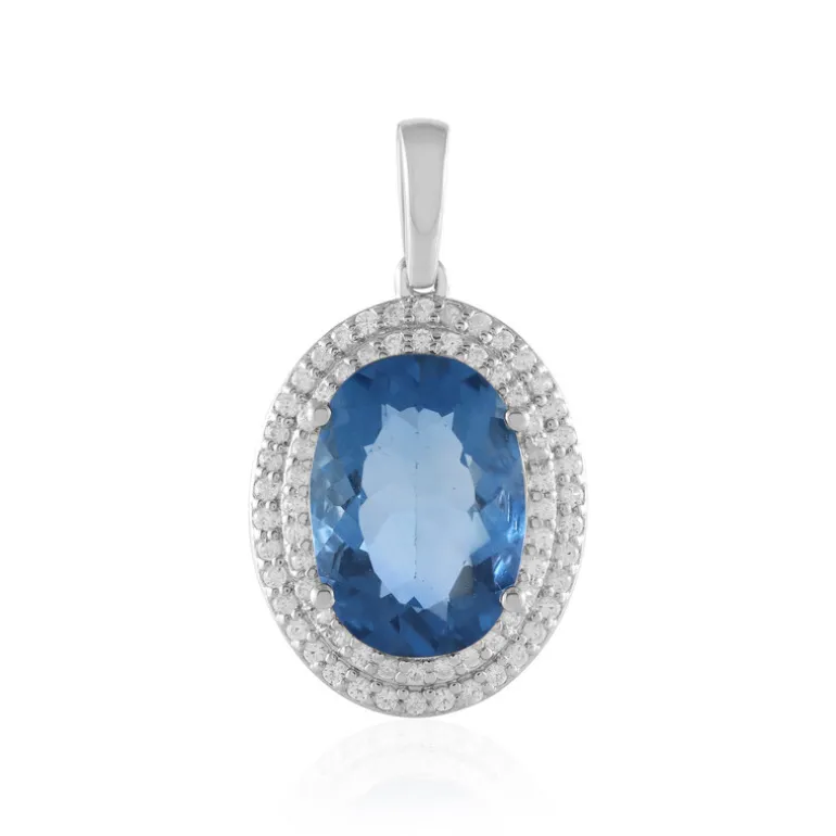 Erhöhen Sie Ihren Stil mit diesem raffinierten Fluorit-Anhänger mit Farbwechsel. Der 5,976 Karat schwere Fluorit mit ovalem Schliff aus China ist von 70 Zirkonen mit rundem Schliff aus Tansania umgeben und wurde aus 925er Sterlingsilber mit Platinbeschichtung gefertigt. Dieses Accessoire eignet sich sowohl für legere als auch für formelle Anlässe und lässt sich wunderbar mit einer Vielzahl von Outfits kombinieren, indem es Ihrem Look einen Hauch von Eleganz und einen Hauch von Faszination verleiht.