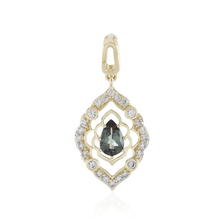 Entdecken Sie das bezaubernde Farbenspiel dieses raffinierten Anhängers aus 9 Karat Gold, der einen faszinierenden tansanischen Farbwechsel-Granat enthält. Dieser seltene Edelstein wiegt 0,428 ct. und ist elegant in eine Tropfenform geschliffen, die das Licht einfängt, um seine chamäleonartigen Eigenschaften zu enthüllen. Ergänzt durch 24 funkelnde Zirkon-Edelsteine von insgesamt 0,346 ct aus Kambodscha strahlt das Design Luxus aus. Mit einer Größe von 26 x 12 mm und einem Gewicht von 1,11 g Gold ist dieser Anhänger ein Zeugnis für Eleganz und Handwerkskunst. Er ist ein Statement-Stück, das perfekt zu einem Abendkleid oder einem formellen Outfit passt und mit Sicherheit alle Blicke auf sich zieht und für Gesprächsstoff sorgt.