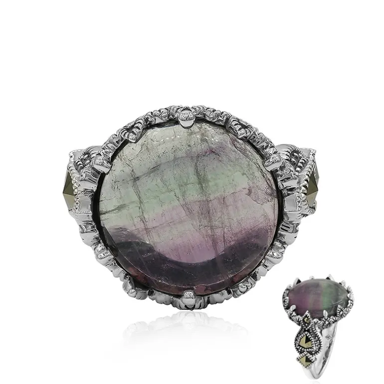 Lassen Sie sich von den bezaubernden Farben dieses exquisiten brasilianischen Fluoritrings verzaubern. Dieser klassische Annette-Ring ist perfekt aus 925er Sterlingsilber gefertigt und verfügt über einen fesselnden runden Fluorit-Cabochon von 8,95 Karat, der von schimmernden österreichischen Marcasit-Steinen umrahmt wird. Mit einem Edelsteingewicht von insgesamt 9,63 ct bietet dieses Stück ein raffiniertes Design, das alle Blicke auf sich zieht. Die harmonische Kombination aus der natürlichen Farbpalette des Fluorits und den glitzernden Marcasiten verleiht diesem Ring einen Hauch von Eleganz und macht ihn zu einer idealen Wahl für besondere Anlässe oder zur Aufwertung Ihres Alltagsstils.