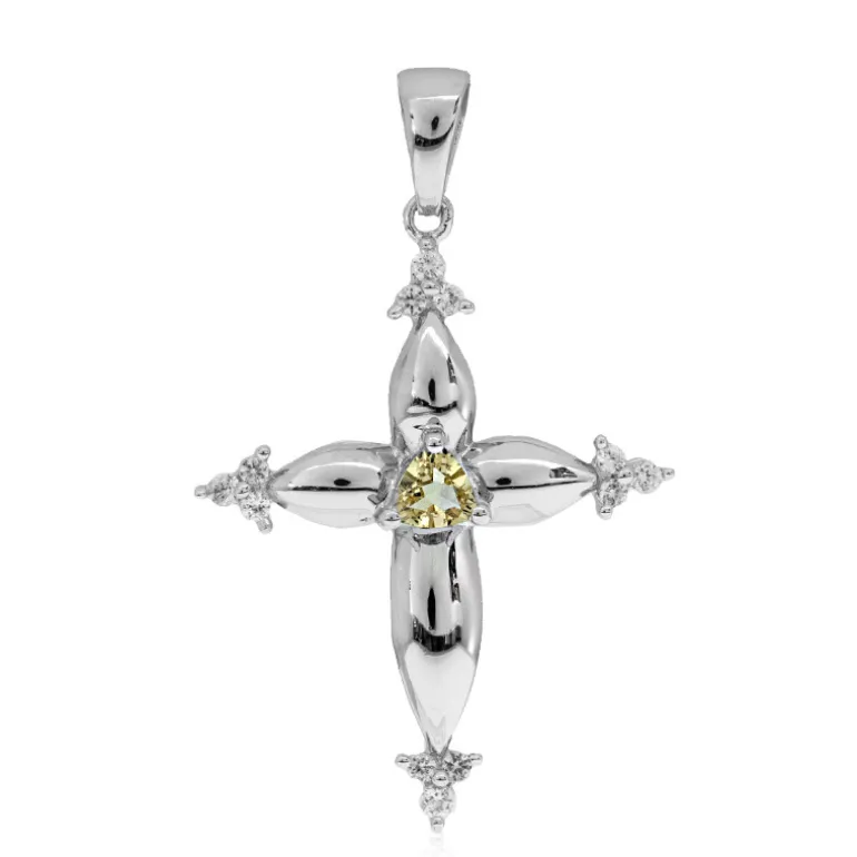 Entdecken Sie den schillernden Charme dieses kreuzförmigen Anhängers mit einem lebhaften brasilianischen gelben Beryll von 0,36 Karat im Trillant-Schliff, der für maximale Brillanz sorgt. Umgeben von zwölf Zirkonsteinen im Rundschliff mit einem Gesamtgewicht von 0,418 ct aus Kambodscha, ist dieses Schmuckstück ein wahrer Ausdruck von Eleganz. Der Anhänger ist aus hochwertigem 925er Sterlingsilber gefertigt und hat ein Gewicht von ca. 3,35 g, was für Langlebigkeit und ein luxuriöses Gefühl sorgt. Dieser Anhänger ist ideal, um Ihre Alltagskleidung aufzuwerten oder Ihrer Abendgarderobe einen Hauch von Eleganz zu verleihen. Er ist eine vielseitige Ergänzung Ihrer Schmucksammlung. Sein sonnengelber Farbton und sein raffiniertes Design ziehen bei jeder Gelegenheit die Blicke auf sich.