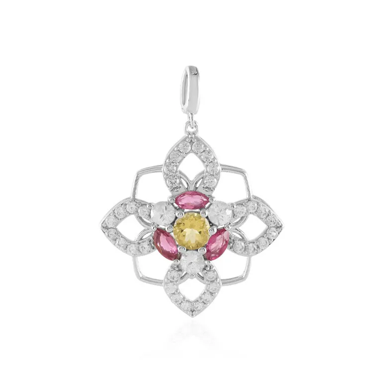 Entdecken Sie die lebendige Anziehungskraft unseres handgefertigten Anhängers mit einem sonnenverwöhnten brasilianischen gelben Beryll als Herzstück, ergänzt durch drei rosafarbene Turmaline im Marquiseschliff aus Nigeria und einen Kranz aus funkelnden Zirkonen aus Kambodscha. Das Schmuckstück aus poliertem, platiniertem 925er Sterlingsilber wiegt etwa 4,57 Gramm und hat ein Gesamtkaratgewicht von 3,772 ct. Sein fesselndes Design ist 40×23 mm groß und ideal, um jedem Ensemble einen Hauch von Farbe und Eleganz zu verleihen. Dieser Anhänger eignet sich sowohl für einen legeren Brunch als auch für einen formellen Abend und wird mit Sicherheit zu einem geschätzten Bestandteil Ihrer Schmucksammlung.