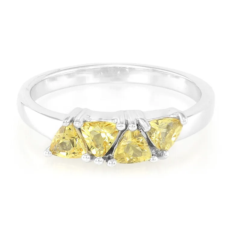 Entdecken Sie die lebendige Anziehungskraft dieses exquisiten Rings mit vier brasilianischen gelben Beryls im Trillant-Schliff von insgesamt 0,64 Karat, gefasst in glänzendem 925er Sterlingsilber. Die einzigartigen, dreieckigen Edelsteine strahlen in sonnigen Farben und werden elegant von dem schlanken Silberring mit einem Gewicht von ca. 2,33 Gramm umrahmt. Dieser Ring ist perfekt, um jedem Ensemble einen Hauch von Sonne zu verleihen. Er ist ein Muss für alle, die den Charme von Farbedelsteinen zu schätzen wissen. Tragen Sie ihn, um Ihren täglichen Look zu verschönern oder um ein schickes Abendoutfit zu ergänzen.