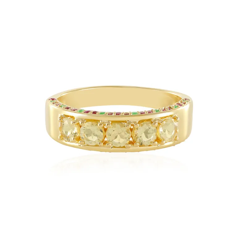 Entdecken Sie die schimmernde Eleganz unseres vergoldeten Rings mit brasilianischem Beryll und Rubin. Dieses exquisite Stück aus 925er Sterlingsilber verfügt über eine warme Goldplattierung, die durch ein Quintett strahlend gelber Berylle von insgesamt 1,095ct ergänzt wird. 34 Rubellite aus Madagaskar und 16 Tsavorite aus Tansania bilden einen subtilen, aber dennoch lebhaften Farbkontrast, der den Ring umgibt. Der runde Schliff maximiert die Brillanz der Edelsteine und macht den Ring zu einem vielseitigen Accessoire für legere und formelle Anlässe. Sein Gesamtkaratgewicht von 1,42 ct ist ein Beweis für seinen Reichtum und seine Qualität.